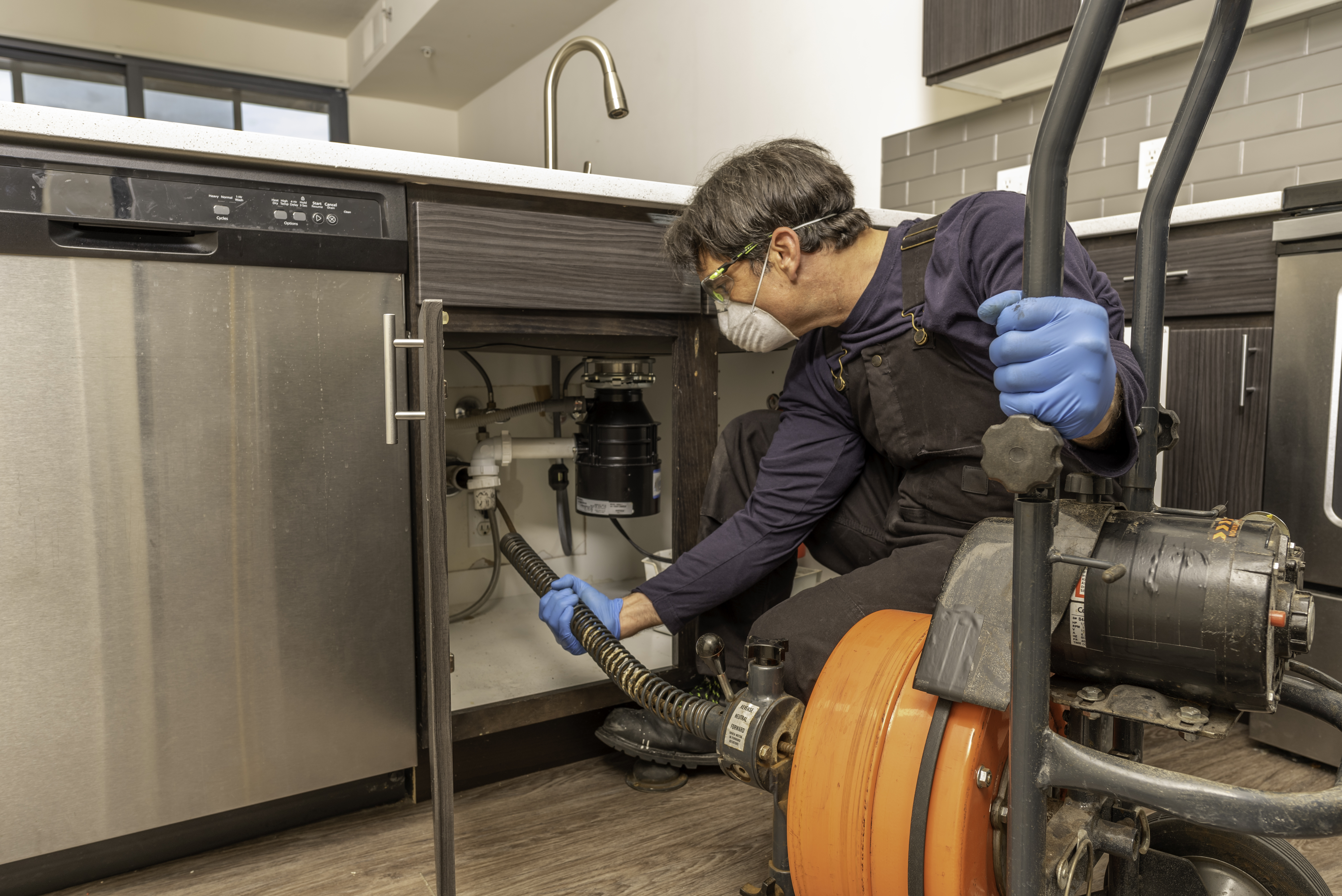 Previous Image Next Image Pro Plumber with Facemask Cleaning Drain Drain cleaning by professional plumber wearing a safety mask, using an auger